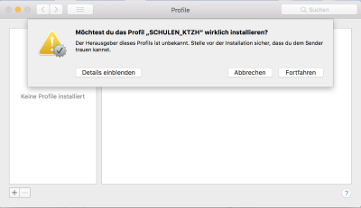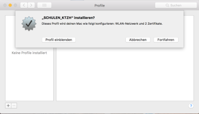 Ihr Mac installiert nun ein Profil. Dieses Profil richtet das Netzwerk „SCHULEN_KTZH“ ein. Bestätigen Sie die Installation mit „Fortfahren“.