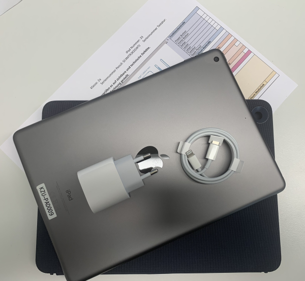 iPad, iPad Netzteil, iPad Lightning Kabel, Tastatur und Überprüfungsformular in den Beutel legen.